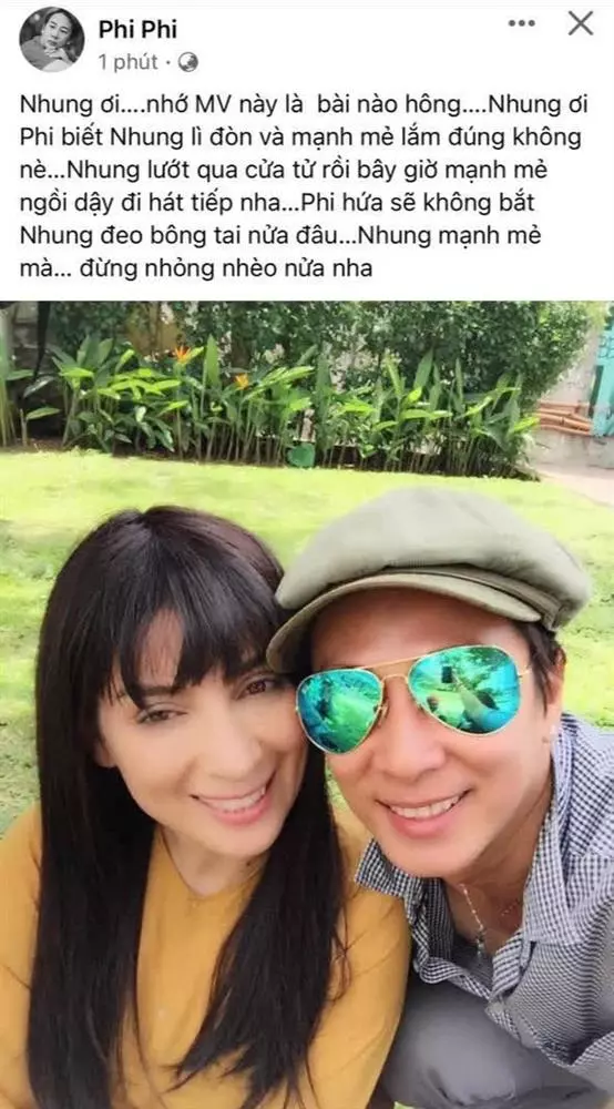 "Nhung ơi, nhớ MV này là bài nào không. Nhung ơi, Phi biết Nhung lì đòn và mạnh mẽ lắm đúng không nè. Nhung lướt qua giây phút nguy hiểm nhất rồi, bây giờ mạnh mẽ ngồi dậy đi hát tiếp nha. Phi hứa sẽ không bắt Nhung đeo bông tai nữa đâu. Nhung mạnh mẽ mà, đừng nhõng nhẽo nữa nha", anh viết.