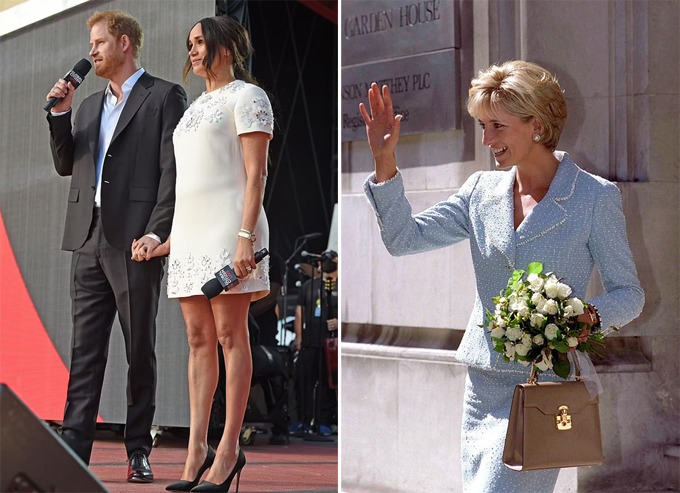 Cuối tuần qua, vợ chồng Harry và Meghan xuất hiện tại buổi hòa nhạc Wokestock do Global Citizen tổ chức ở Công viên Trung tâm New York nhằm kêu gọi công bằng vaccine. Nữ công tước 40 tuổi mặc chiếc váy cộc tay màu trắng đính đá quý của Valentino trị giá 4.500 USD khi lên sân khấu. Lúc ra về, cô choàng áo khoác đen bên ngoài, cầm túi Lady D-Lite của nhà mốt Christian Dior có giá bán lẻ khoảng 4.700 USD.