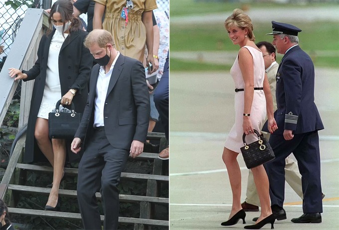 Meghan xách mẫu túi Dior ở sự kiện hôm 25/9 (trái) và Diana ở Argentina năm 1996 (phải). Ảnh: DM/Tim Graham