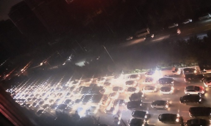 Dòng xe ùn tắc do đèn giao thông bị mất điện ở thành phố Thẩm Dương hôm 23/9. Ảnh: SCMP.