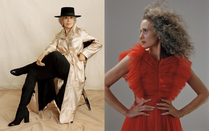 Diễn viên Andie MacDowell (phải) khoe nhan sắc ở tuổi 63 bên Jane Fonda. Ảnh: Vogue