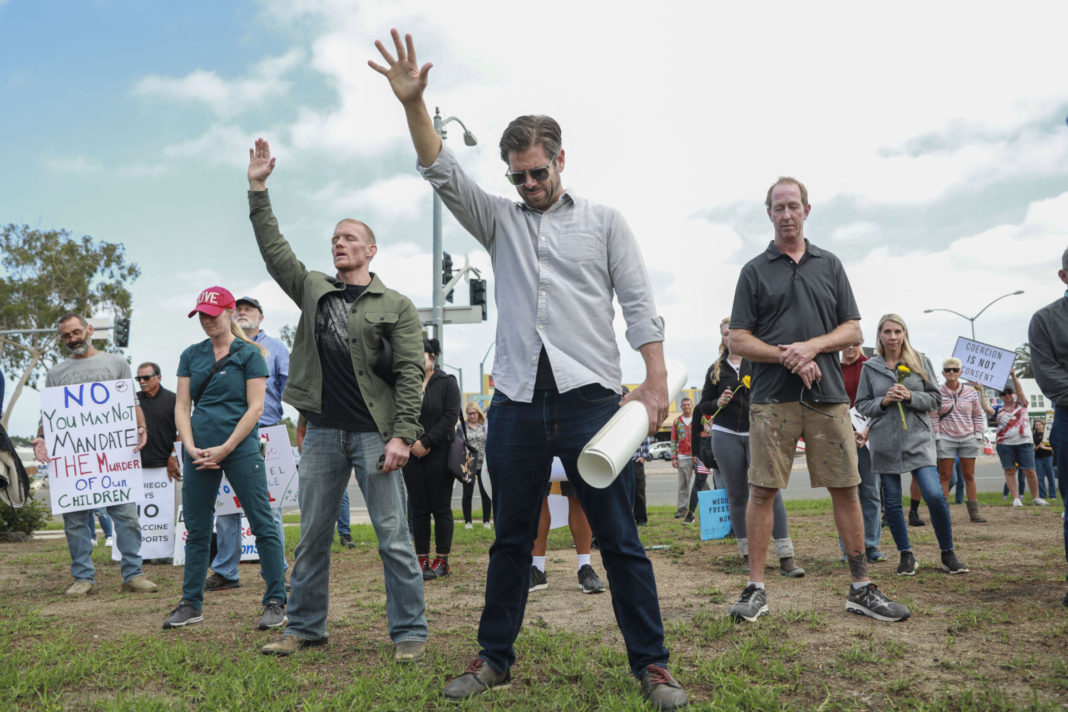 Thành phần chống đối đeo khẩu trang và chích ngừa tay chào kiểu Đức Quốc Xã tại cuộc họp của học khu San Diego Unified School District. (Hình: Sandy Huffaker/Getty Images)