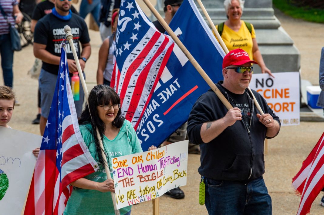 Những người chống chích ngừa cầm cờ ủng hộ Trump đội nón MAGA biểu tình tại New Hampshire. (Hình: JOSEPH PREZIOSO/AFP via Getty Images)