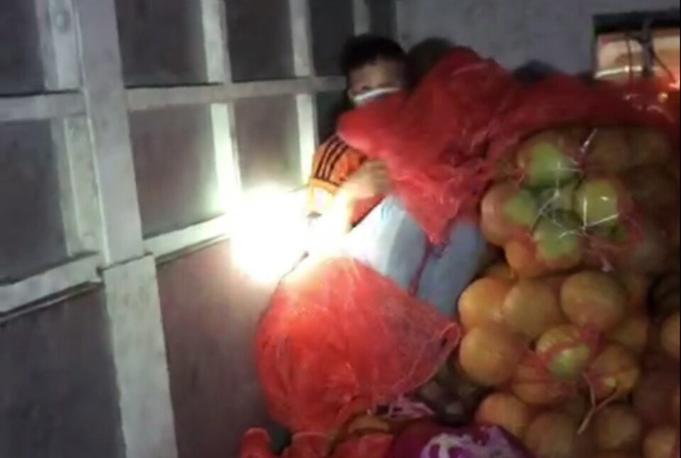 Kiểm tra, phát hiện Đặng Văn Sáu không có giấy xét nghiệm âm tính COVID-19, đang trốn trên thùng xe tải do Bùi Tuấn Anh điều khiển. Ảnh: TTXVN phát