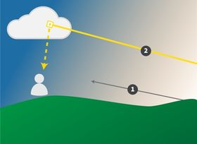 Cụ thể, trong ảnh minh họa bên dưới, lúc này tia sáng 1 tới từ nguồn sáng là Mặt Trời đã lặn xuống đường chân trời, trong khi đó tia sáng 2 lại được phản xạ bởi hơi nước/tinh thể băng/hạt tới người quan sát trong tầng khí quyển gần mặt đất (low atmosphere).