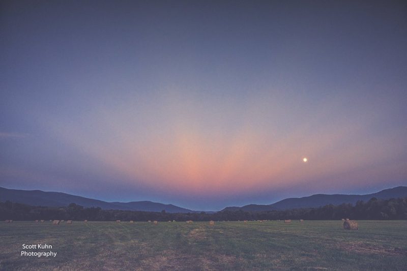 - Alpenglow: Đây là hiện tượng quang học khí quyển xuất hiện như là một dải/vệt màu đỏ nằm vắt ngang ở gần chân trời, ở phía đối diện so với Mặt Trời (thời điểm này là hướng Đông đúng như ghi nhận của người dân) khi mà đĩa Mặt Trời đã ở dưới đường chân trời (chính là thời điểm Mặt Trời lặn, trùng với thông tin người dân cung cấp).