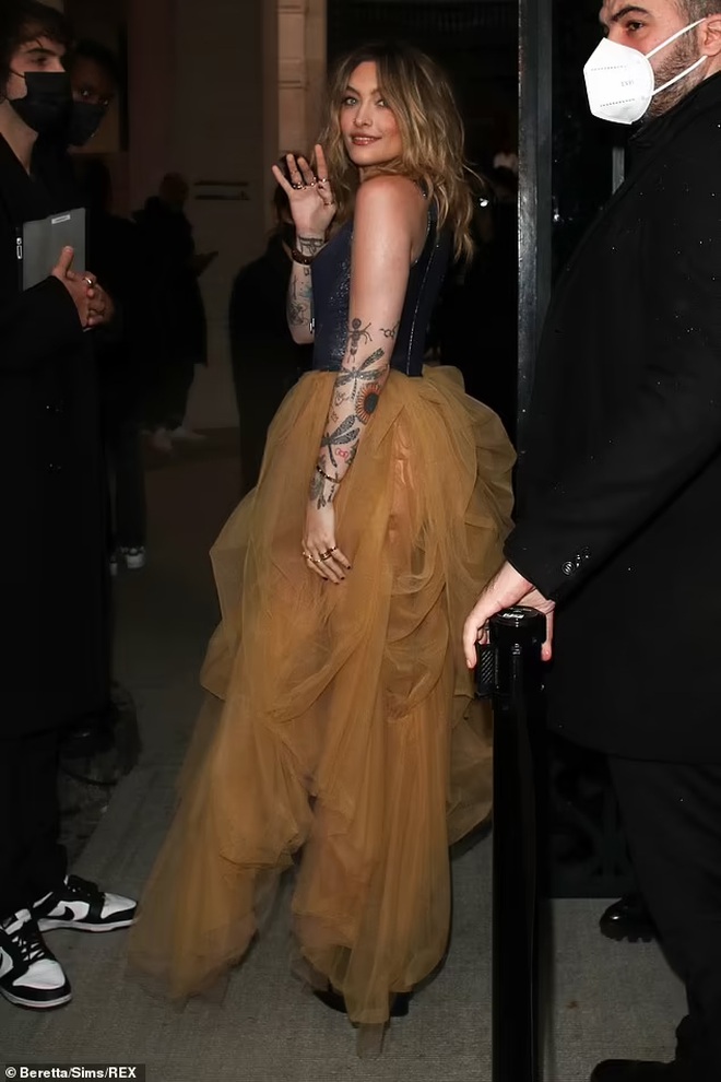 Người mẫu - Diễn viên trẻ Paris Jackson bất ngờ xuất hiện tại triển lãm của tạp chí Vogue tổ chức trong khuôn khổ tuần lễ thời trang Paris, Pháp hôm 1/10. Con gái của Vua nhạc Pop Michael Jackson khoe loạt hình xăm cá tính trong bộ váy lạ mắt và sành điệu.