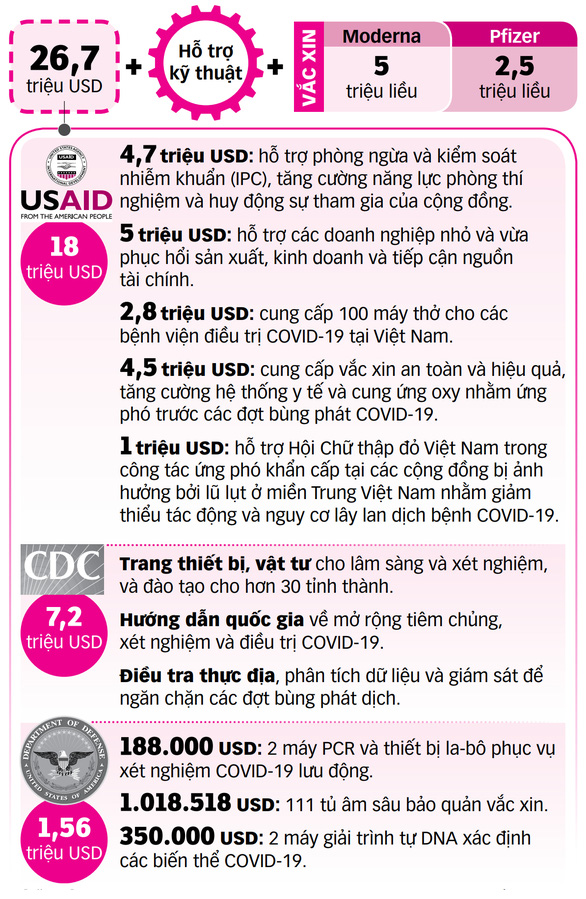 Với lô viện trợ vắc xin mới nhất, Mỹ đã cung cấp tổng cộng 7,5 triệu liều vắc xin cho Việt Nam thông qua Cơ chế COVAX . Bên cạnh đó, Bộ Quốc phòng Mỹ viện trợ cho Việt Nam 111 tủ lạnh âm sâu để bảo quản vắc xin ở 63 tỉnh thành.
