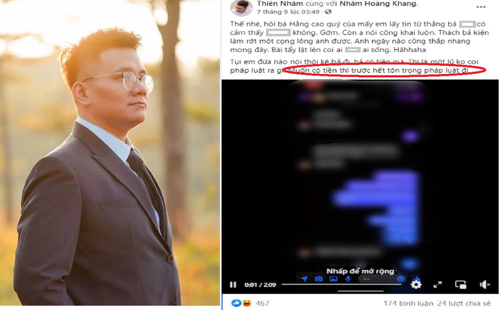 Trong đó, một bài đăng cùng tuyên bố trái ngược với tình hình hiện tại của Khang được cư dân mạng chia sẻ lại. Theo đó, ngày 7/9, trên tài khoản Thiên Nhâm có tick xanh được Nhâm Hoàng Khang thường xuyên sử dụng đã đăng tải bài viết về một nữ CEO với tuyên bố đáng chú ý: "Muốn có tiền thì trước hết tôn trọng pháp luật đi".