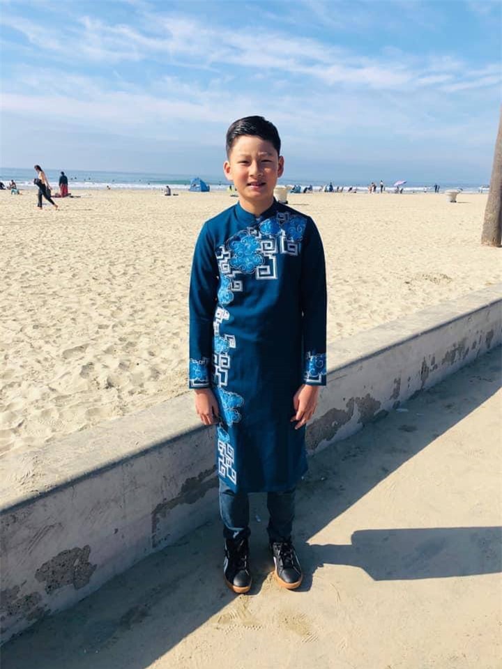 Con trai Jennifer Phạm thích mặc trang phục thoải mái với quần jeans, áo thun. Khi diện áo dài cùng quần jeans và giày thể thao, trông Bảo Nam vô cùng sành điệu.