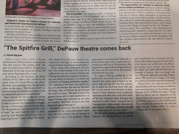 Bài viết về buổi nhạc kịch trực tiếp tại trường của Hân đăng trên bản giấy The DePauw, với bút danh Hazel Nguyen. Ảnh: Nhân vật cung cấp