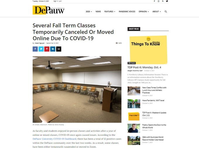Bài viết đầu tiên của Hân - về các lớp học trực tiếp tạm thời hoãn hoặc chuyển sang trực tuyến sau khi có các ca mắc Covid-19 ở trường - trên bản online của tờ The DePauw. Ảnh: Nhân vật cung cấp