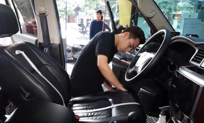 Một nhân viên đang vệ sinh nội thất tại cơ sở chăm sóc xe. Ảnh: Huy Mạnh