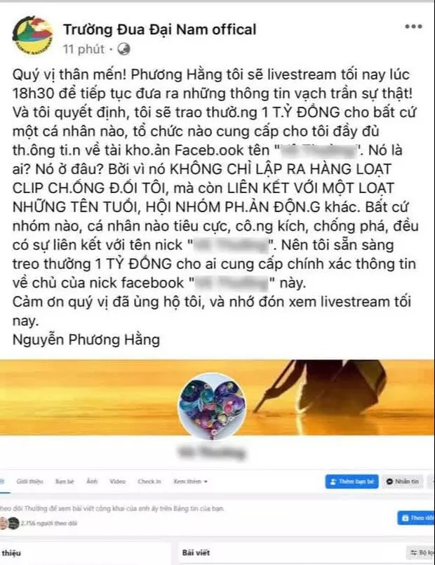 Ảnh chụp màn hình bài đăng treo thưởng 1 tỷ của bà Phương Hằng cách đây vài tháng.