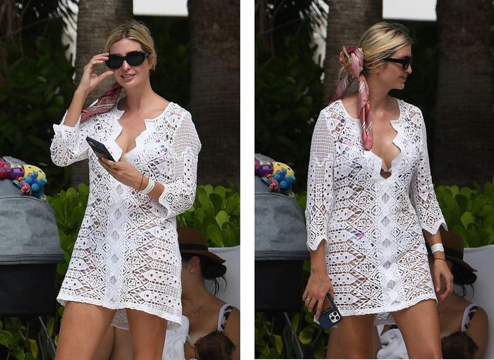 Mới đây, Ivanka đã bị giới paparazzi ghi lại hình ảnh lúc cô cùng chồng và các con vui chơi tại công viên nước ở Miami, Mỹ. Không chỉ nổi bật với sắc vóc nổi trội mà Ivanka còn gây chú ý khi diện bikini. Cô diện bộ áo tắm 2 mảnh để lộ vòng 1 đẫy đà cùng đôi chân dài trứ danh. Ái nữ cựu Tổng thống Mỹ cũng khéo léo che chắn bằng chiếc váy ren trắng dài tay bên ngoài.