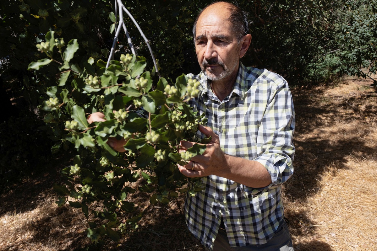 Ricardo San Martin - chuyên gia người Chile về cây quillay và các ứng dụng trong ngành công nghiệp của loại cây này - đếm hạt trên cây trong khuôn viên Đại học California ở Berkeley, Mỹ. Ảnh: Reuters.