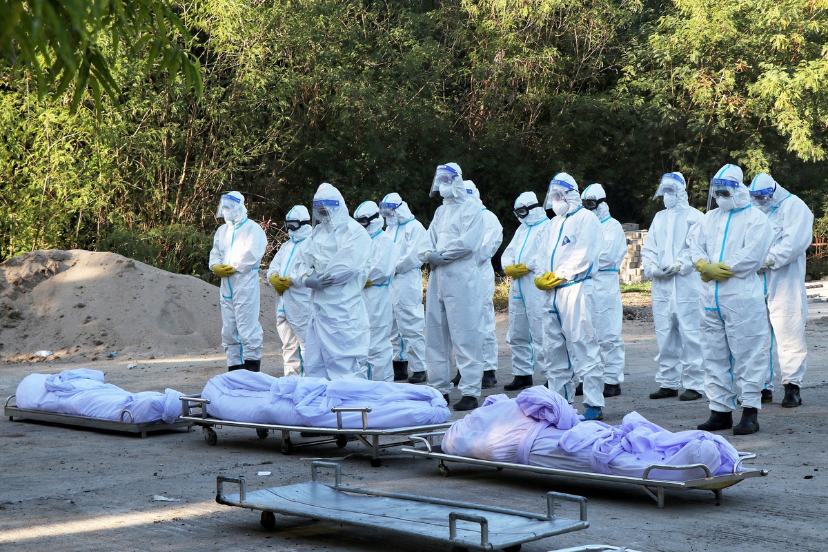 Tình nguyện viên cầu nguyện trước thi thể của nạn nhân Covid-19 tại một nghĩa trang ở Mandalay, Myanmar, ngày 14/7. Ảnh: Reuters.
