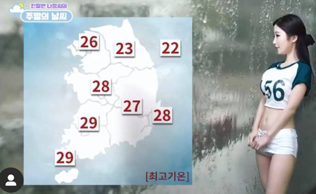 Kim Na Young là người mẫu đang nhận được nhiều sự chú ý khi xuất hiện trong vai trò MC dẫn bản tin thời tiết do tạp chí Maxim thực hiện trong thời gian gần đây.