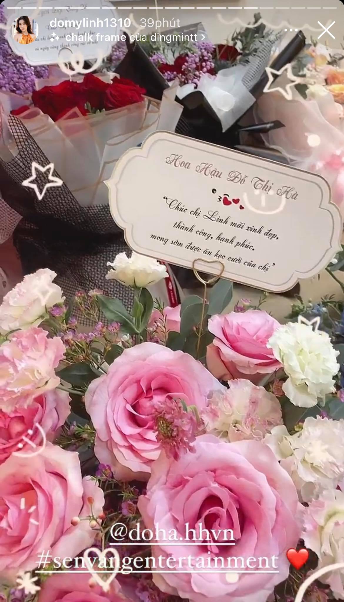 Đáng chú ý, Đỗ Mỹ Linh đã đăng ảnh bó hoa được nhận từ Đỗ Thị Hà kèm dòng chúc mừng vô cùng đáng yêu: "Chúc chị Linh mãi xinh đẹp, thành công, hạnh phúc. Mong sớm được ăn kẹo cưới của chị". Chỉ với chi tiết nhỏ này cũng thể hiện mối quan hệ chị em của cả hai vẫn thân thiết, tốt đẹp chứ không căng thẳng như lời đồn