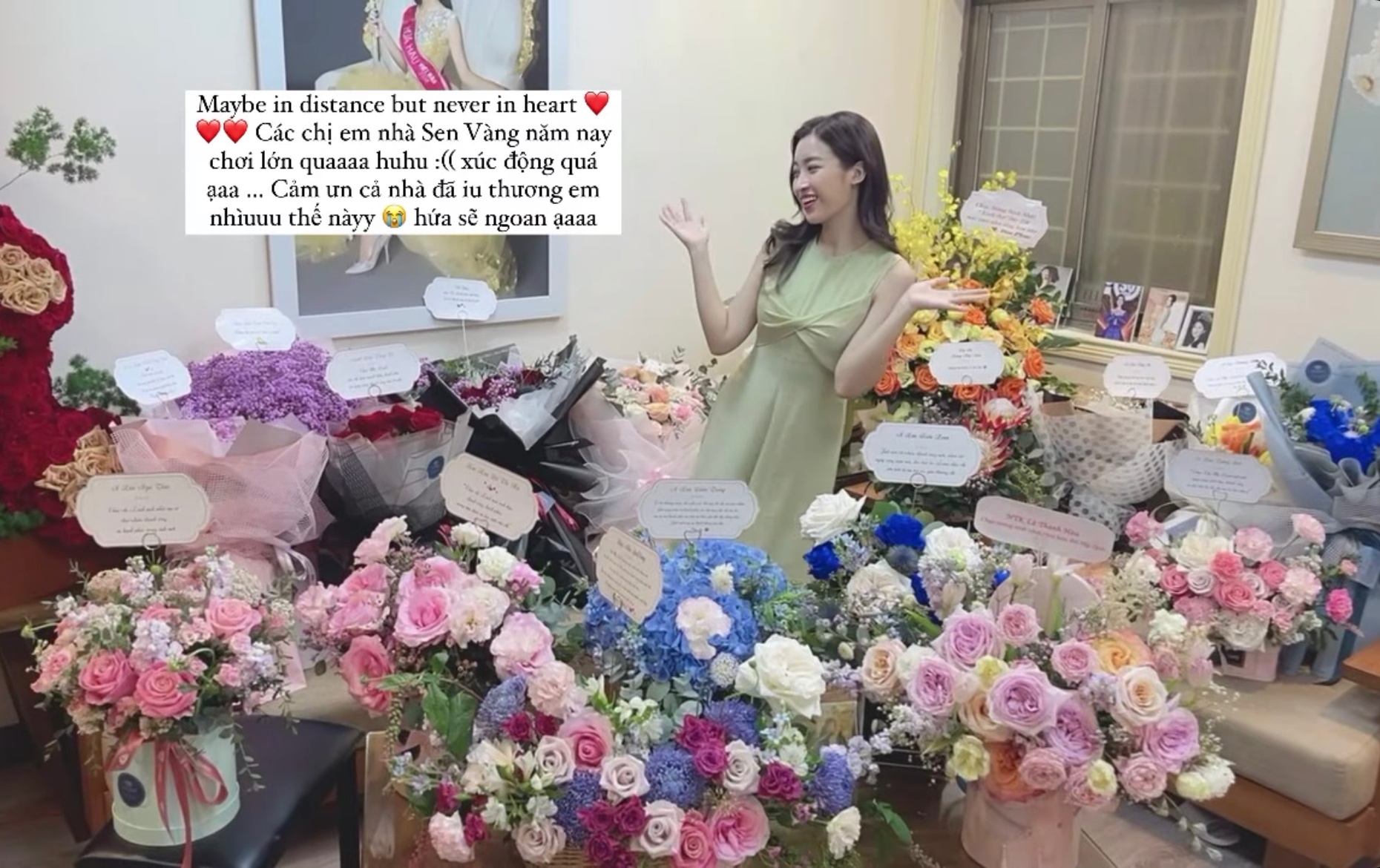 Đỗ Mỹ Linh hạnh phúc giữa rừng hoa do các chị em Hoa hậu gửi tặng mừng sinh nhật