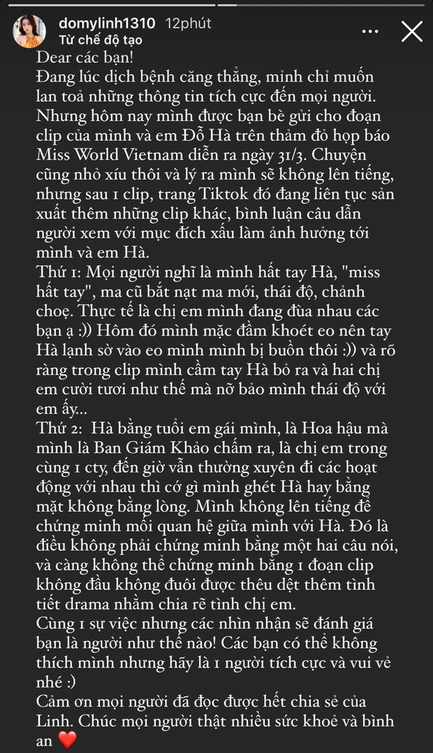 Trước đó, Đỗ Mỹ Linh đã lên tiếng giải thích về hành động bị cho là "khó ở" với Hoa hậu Đỗ Thị Hà
