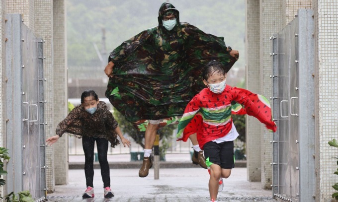 Một gia đình chạy trong mưa ở Chai Wan, Hong Kong hôm nay. Ảnh: SCMP.