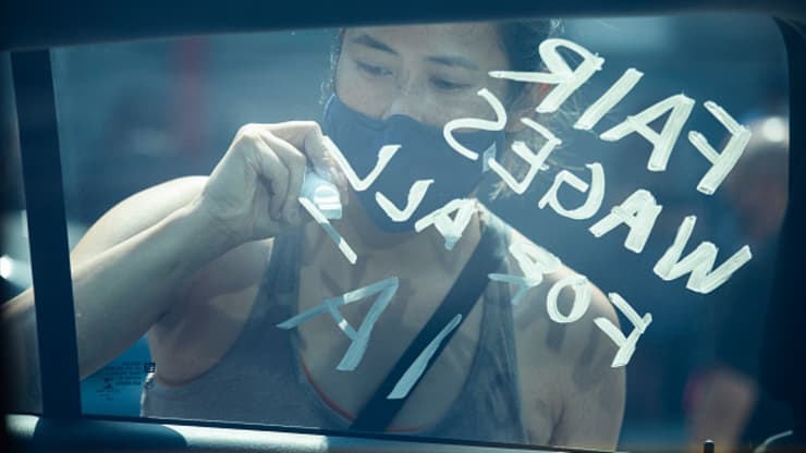 Thành viên Hiệp hội Biên tập Ảnh Điện ảnh ở đơn vị Local 700 viết thông điệp về mức lương công bằng cho tất cả các thành viên lên xe hơi trong cuộc biểu tình ngày 26/9 tại Los Angeles, Mỹ. Ảnh: Los Angeles Times.