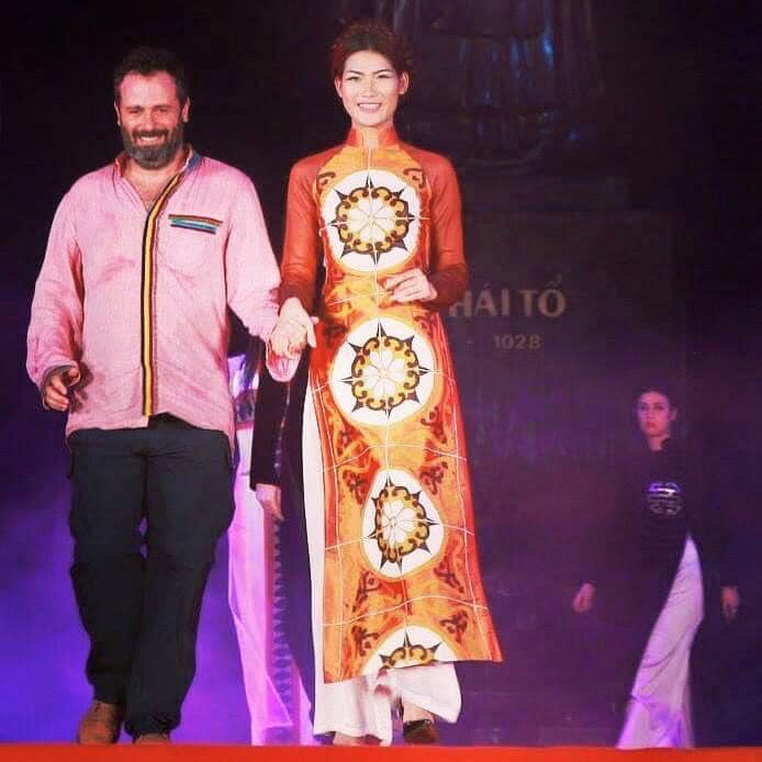 Nhà thiết kế Diego Del Valle Cortizas (ảnh trái) xuất hiện trên sân khấu cùng người mẫu. Ảnh: FB Diego Del Valle Cortizas.