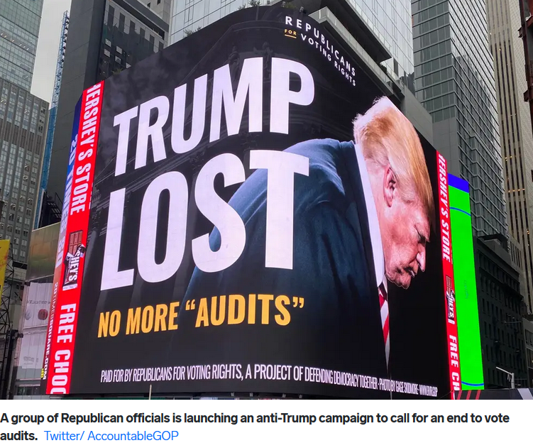 A group of Republicans is putting up billboards across America to remind former President Donald Trump that he lost last year's election, starting with a gigantic display in Times Square.