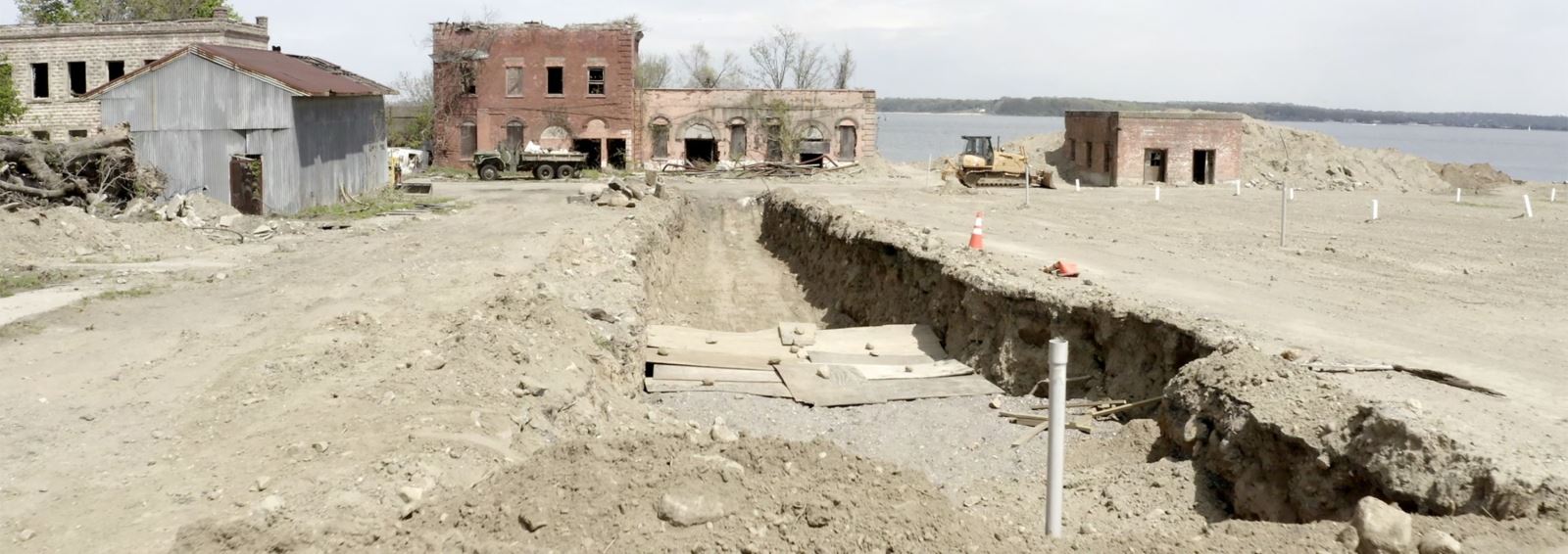 Một ngôi mộ tập thể trên đảo Hart, phía trước các tòa nhà bỏ hoang vào tháng 5/2021. Ảnh: Bloomberg