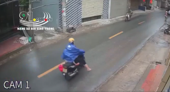 Một đoạn video ngắn do camera anh ninh ghi lại. Hình ảnh cho thấy một người đàn ông đang điều khiển xe máy chở theo con nhỏ. Bất ngờ đứa bé ngồi sau ngã bổ nhào.