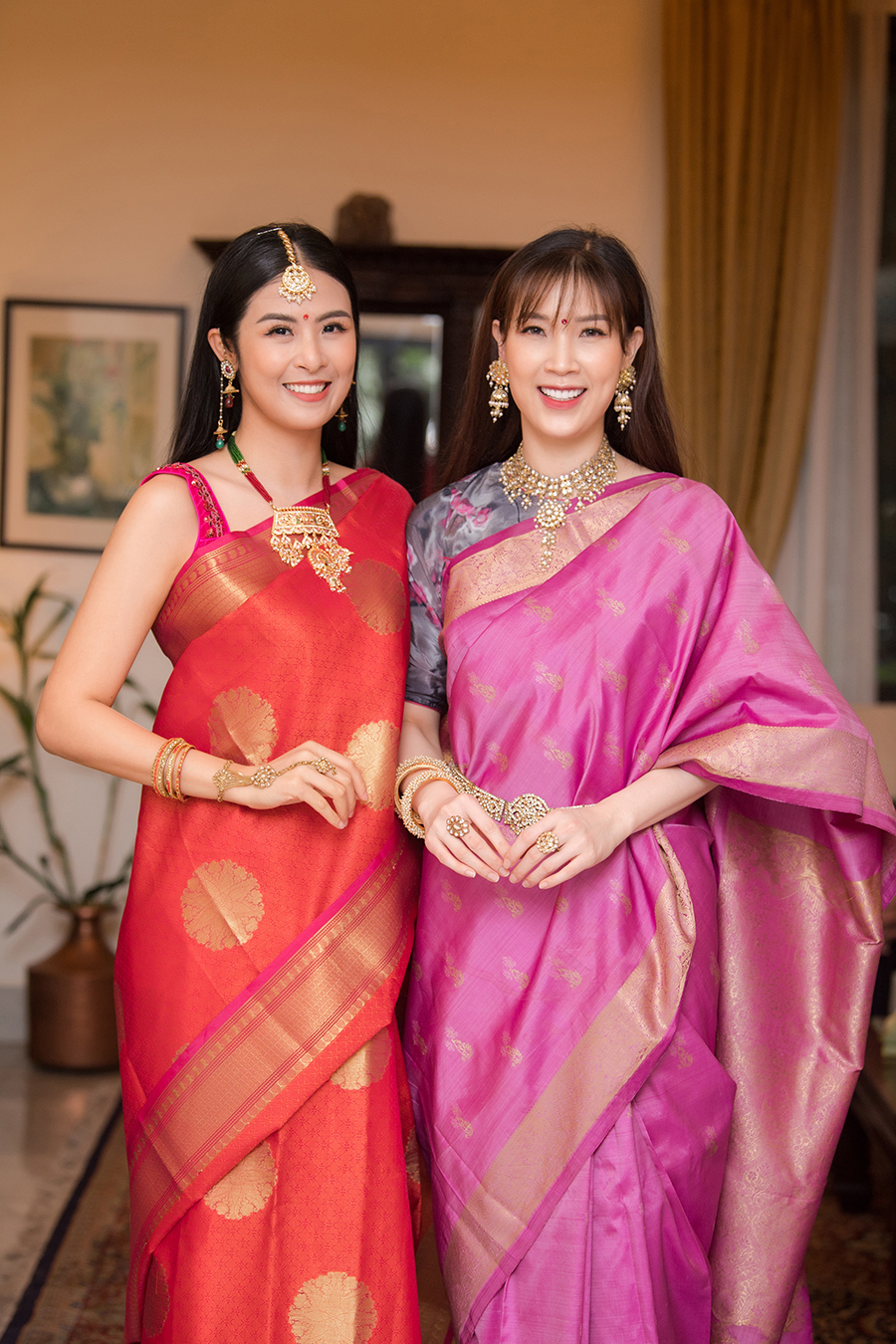 Cả hai người đẹp đều được phu nhân đại sứ Ấn Độ khen xinh đẹp khi mặc sari.