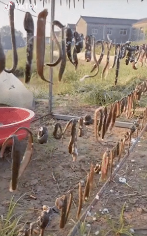 Nhìn cận, dễ thấy dù cơ thể đã bị phơi nắng và khô đi một chút nhưng những sinh vật này vẫn có sức sống mãnh liệt. Chúng liên tục uốn éo cơ thể trên giá treo, tạo nên cảnh tượng khá lạ mắt.