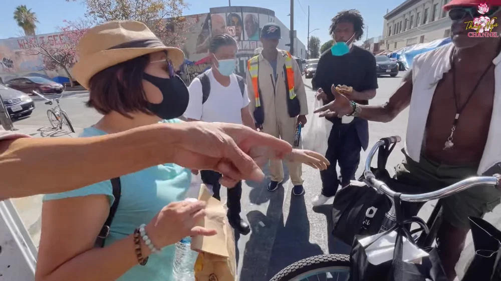 Danh hài Thúy Nga có kinh nghiệm phát đồ khi tới được những khu rất đông người vô gia cư. Đa số họ là người Mỹ gốc Phi, lớn tuổi và phụ nữ, ngoài ra cũng có người da trắng và châu Á. Nhìn ai cũng nghèo khổ, rách rưới, khi vừa nãy tôi bị người vô gia cư kiếm chuyện, tấn công hung tợn, tạt nước vào tôi luôn, sợ hãi vô cùng. Tôi phải chạy nín thở luôn.