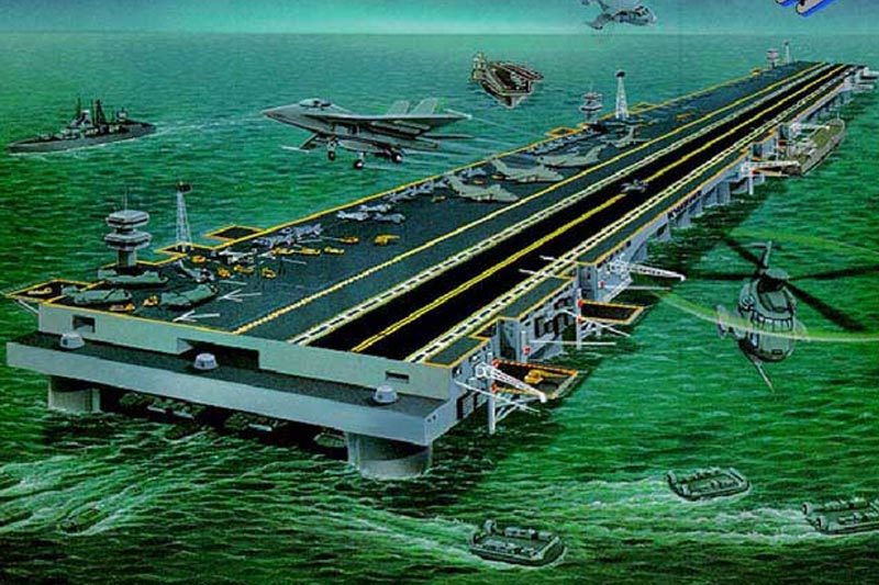Trước việc một số nước thúc đẩy xây dựng đảo nhân tạo và căn cứ tiền đồn trên biển, các chuyên gia quân sự Mỹ đã đề xuất triển khai Tổ hợp căn cứ di động ngoài khơi (JMOB).Ngay từ khi một số nước Trung Đông và Nam Âu không cho phép Mỹ sử dụng các căn cứ quân sự của họ tấn công Iraq, giới quân sự Mỹ đã tính đến việc đầu tư nghiên cứu, chế tạo JMOB. Kinh nghiệm đóng tàu vận tải chở container cỡ lớn và trình độ xây dựng các cơ sở khai thác tài nguyên ở những vùng biển sâu đã giúp các kỹ sư Mỹ giải quyết hầu như toàn bộ các vấn đề về chuyên môn trong thiết kế JMOB.Theo cơ quan nghiên cứu hải quân Mỹ, JMOB được thiết kế để bảo đảm thực hiện chiến thuật cho cả hải quân và lính thủy đánh bộ. Một JMOB lớn, hoàn chỉnh gồm 5 mô-đun riêng lẻ lắp ghép lại với nhau. Trong đó, mỗi mô-đun đều có thể di chuyển độc lập bằng động cơ diesel-motor điện với tốc độ 32km/giờ. Chiều rộng của một mô-đun khoảng 152m, dài 300m và chiều cao nổi trên mặt nước là 36,5m.