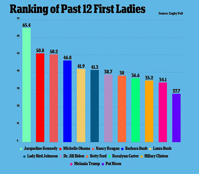 Trang Zogby Analytics vừa công bố kết quả thăm dò dựa trên ý kiến của 5.437 người dân Mỹ về 12 phụ nữ đã và đang là Đệ nhất phu nhân. Bà Jackie Kennedy - người từng trở thành đề tài thu hút sự chú ý của công chúng sau khi chồng Jack Kennedy bị ám sát - hiện vẫn là người được yêu mến nhất. Gia đình Kennedy vào Nhà trắng năm 1961 và nhanh chóng được công chúng yêu mến với hình ảnh đẹp đẽ, trẻ trung. Tuy nhiên, Tổng thống Kennedy sớm qua đời vào năm 1963 và Jackie cũng tái hôn với Aristole Onassis 5 năm sau. Mặc dù vậy, bà vẫn được coi là cựu Đệ nhất phu nhân có sức ảnh hưởng đến khi qua đời vào năm 1994.