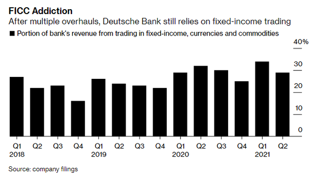 Bộ phận giao dịch hàng hóa, tiền tệ và trái phiếu đóng góp bao nhiêu vào doanh thu của Deutsche Bank?
