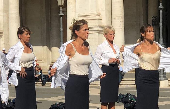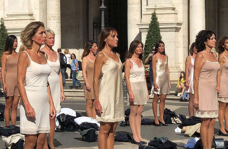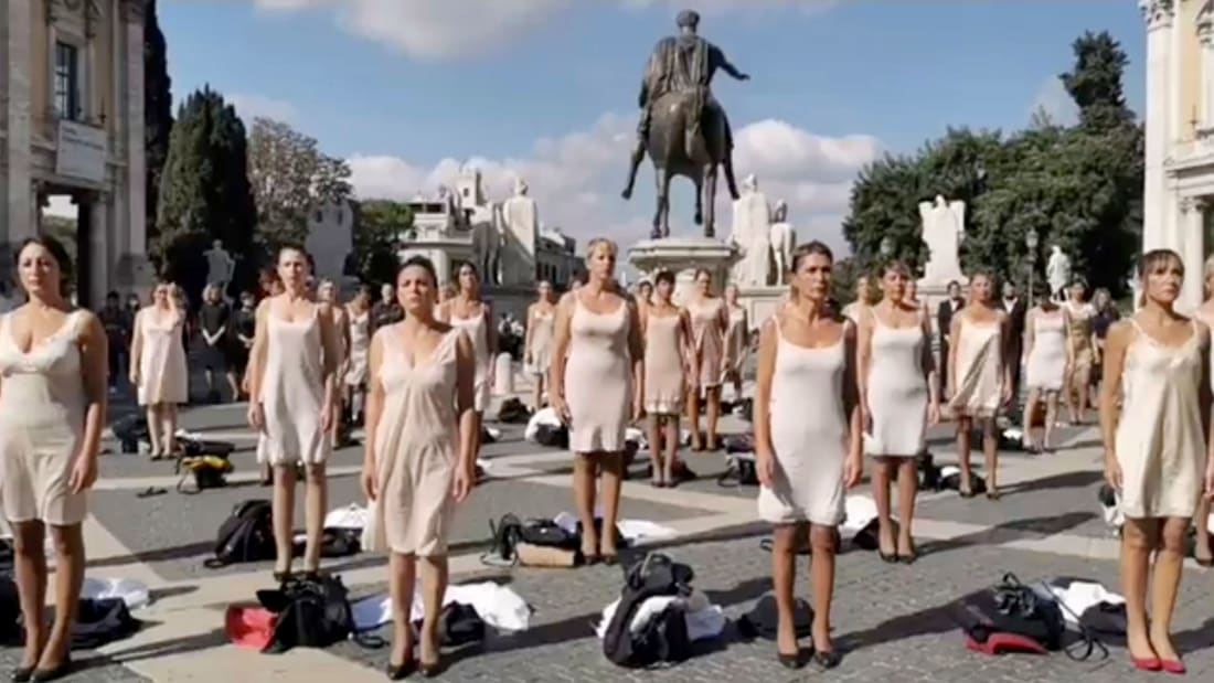 Các nữ tiếp viên hàng không hãng Alitalia xuất hiện và cởi đồ ở quảng trường Campidoglio hôm thứ Bảy 23/10. Ảnh The Hill.