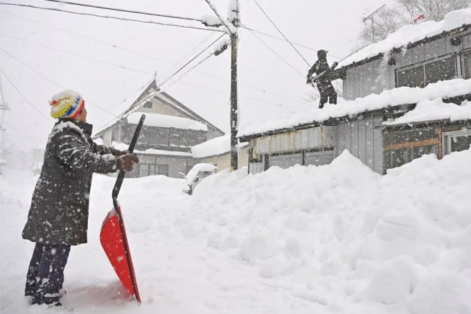 Người dân phía đông Nhật Bản dọn tuyết trên mái nhà mùa đông năm ngoái. Ảnh: Kyodo News