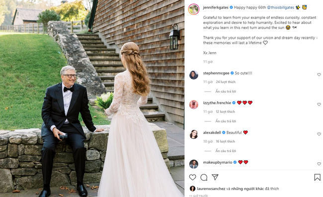 "Mừng sinh nhật tuổi 66 của bố. Con luôn biết ơn vì được học hỏi từ tấm gương của bố về trí tò mò, không ngừng khám phá và mong muốn góp sức cho nhân loại. Cảm ơn bố vì luôn ủng hộ tình cảm và mơ ước của chúng con. Đó là những kỷ niệm sẽ theo con suốt cuộc đời", Jennifer Gates đăng lên Instagram hôm 28/10.
