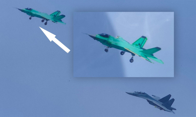 Nguyên mẫu tiêm kích hạm dòng FC-31 bay cùng một tiêm kích trong ảnh công bố ngày 29/10. Ảnh: Twitter/Rupprecht_A.