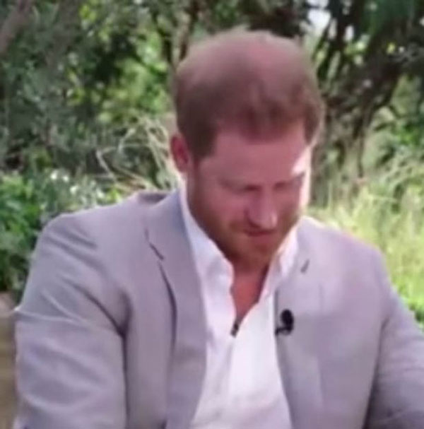 Harry cúi đầu, lấy lại gương mặt buồn rầu sau khi cười trong cuộc phỏng vấn với Oprah. Ảnh chụp màn hình