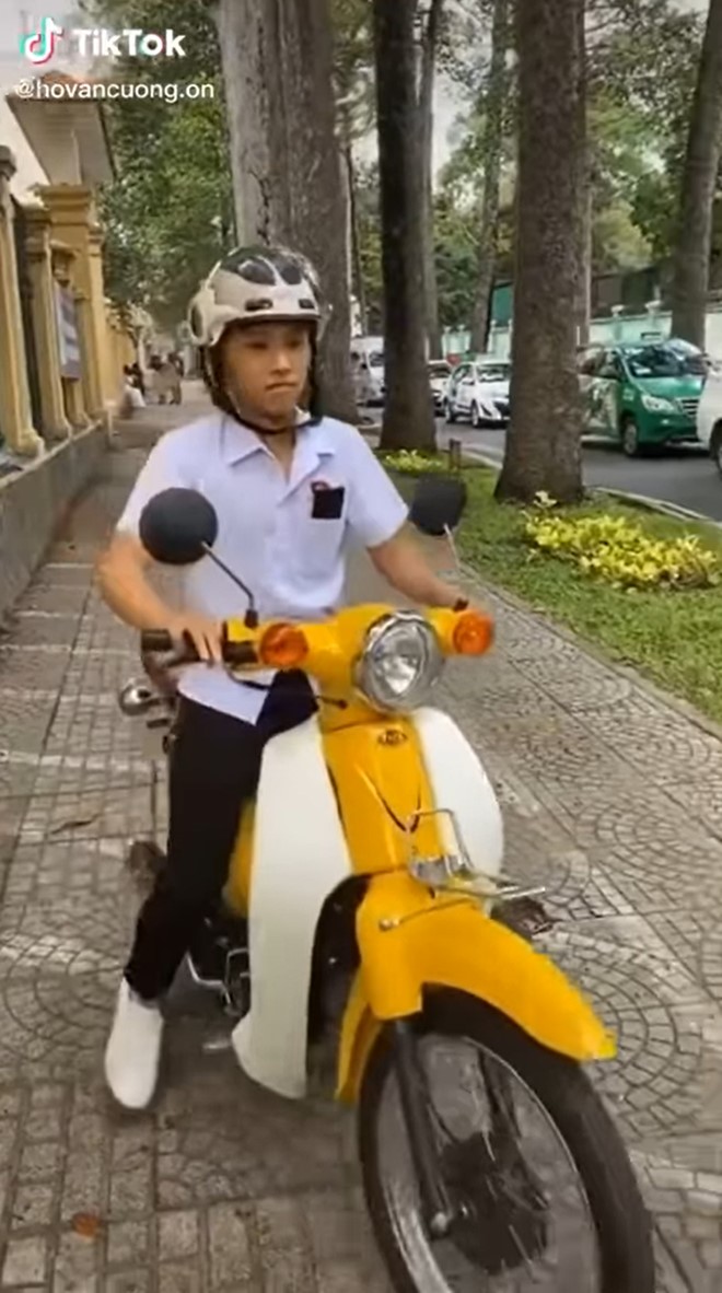 Dân mạng đang lan truyền clip Hồ Văn Cường diện trang phục học sinh, lái xe cub. Trong một đoạn clip được ghi lại. Hồ Văn Cường đội mũ bảo hiểm chỉn chu, mặc áo sơ mi trắng đang lái thử chiếc xe cub màu vàng - trắng khá mới.