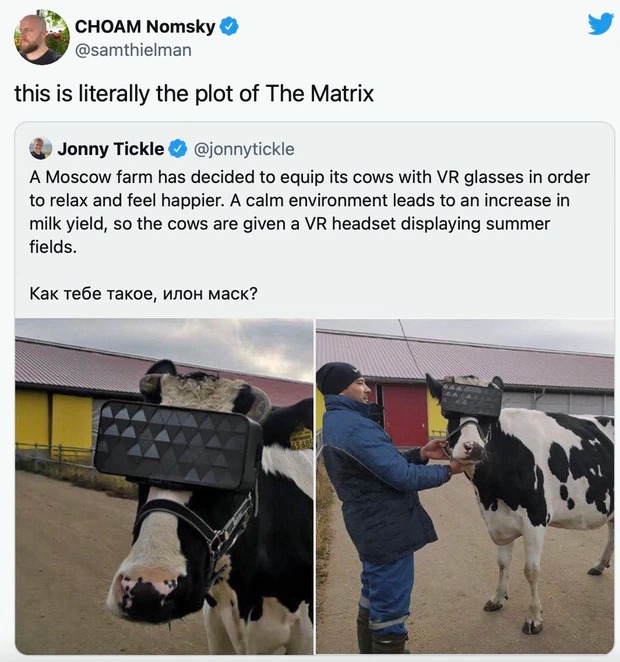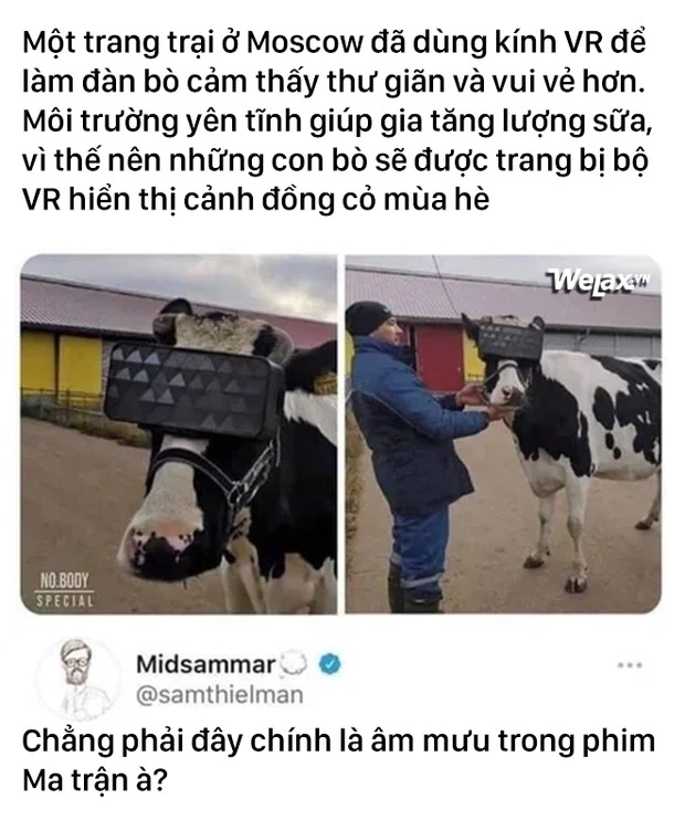 Vấn đề là trong mùa đông thì lấy đâu ra đồng cỏ đẹp cỡ đó? Vậy là họ cho bò đeo kính VR, để chúng thoải mái hơn, từ đó cho nhiều sữa hơn.