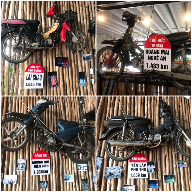 Trong quán của anh Toàn hiện có 9 “chiến mã” như vậy, được treo lên vách, cùng mô hình các cột mốc, nơi đi, nơi đến, số km, cùng những hình ảnh chụp các chủ nhân thời điểm trao nhận xe tại hiện trường. Chiếc gãy đầu, chiếc vỡ lốp. Có chiếc xe Cup 50 má phanh đã mòn, xích đã tung, dầu nhỏ giọt… Lo cho sự an toàn của bà con khi đường hồi hương còn rất xa, anh em CLB xe bán tải TP Đà Nẵng đã tặng 19 chiếc xe máy trong đó 15 chiếc mới nguyên, và 4 chiếc đã qua sử dụng nhưng còn chạy tốt. Và có 9 “chiến mã” tả tơi được anh em xin giữ lại làm kỷ niệm.