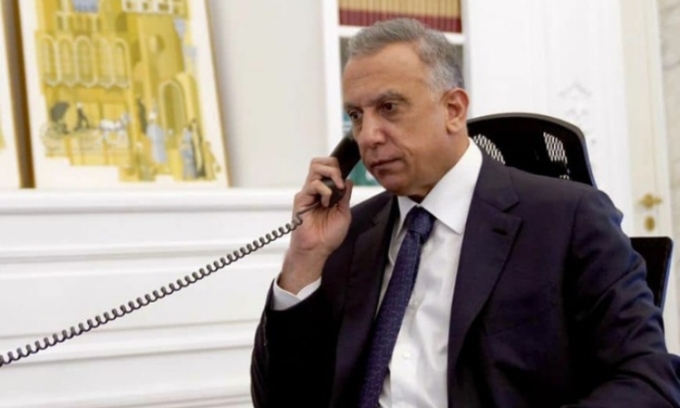 Thủ tướng Iraq Mustafa al-Kadhimi nói chuyện điện thoại trong văn phòng hôm 7/11. Ảnh: Reuters.
