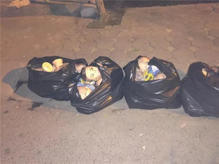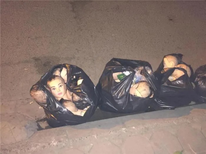 Nhưng vừa ra đến cửa thì gặp cảnh này, 4 chiếc túi đen to đùng đựng đầy những chiếc đầu... ma-nơ-canh khiến bạn trẻ kinh hãi bỏ chạy rơi cả dép. Mãi sau mới trấn tĩnh được mà quay lại chụp ảnh post lên mạng.