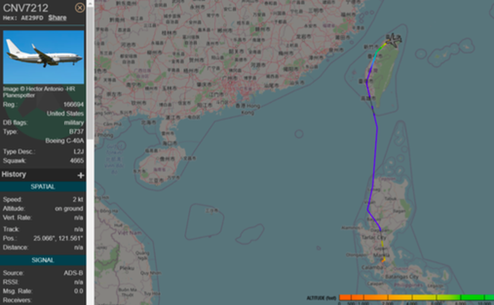 Tối qua, trang facebook mang tên “Không phận tây nam Đài Loan” đăng hình ảnh đường bay của chiếc Boeing C-40A từ căn cứ không quân Clark ở Philippines đến phía bắc Đài Loan (Trung Quốc). Trang này nêu chi tiết số đuôi của chiếc CNV7212 dựa trên 2 trang web chuyên theo dõi hoạt động bay Flightradar24 và FlightAware.