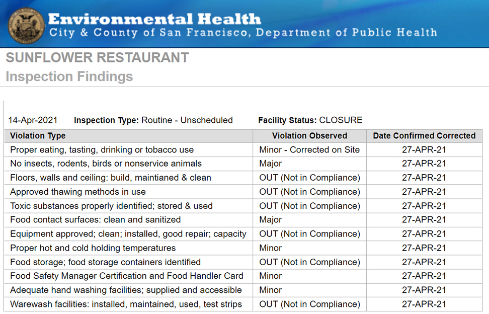 Sunflower Restaurant – 506 Phố Valencia – Nhà hàng này đã đạt xếp hạng tồi tệ là 46 trên 100 trong một cuộc kiểm tra gần đây. Cơ sở này đã bị tuyên bố vì nhân viên của mình có bàn tay không sạch sẽ và sử dụng găng tay không đúng cách trong chế biến thực phẩm (trong số các vi phạm khác).