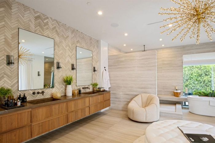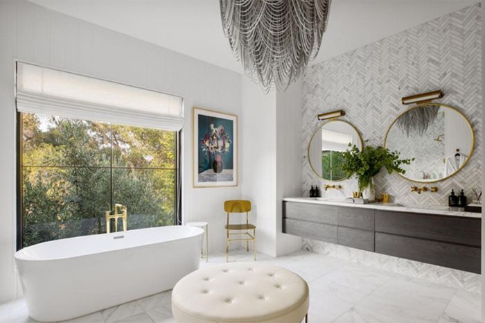 Bồn tắm bên cửa sổ, đèn chùm sắc sảo và nền gạch lát chevron, phòng tắm riêng là nơi thư giãn tuyệt vời dành cho các ngôi sao hàng đầu Hollywood.
